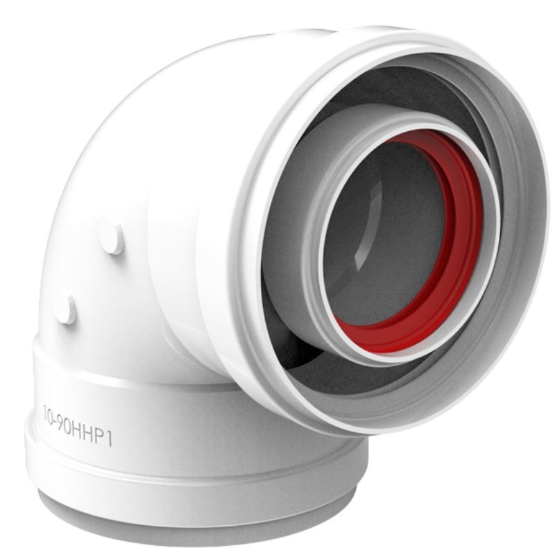 Der 90°-Koaxialbogen (Abb. Ø 60/100 mm) für die Abgasführung von Brennwertkesseln ist für Brennwertkessel mit einem Ø 60/100 mm Koaxialsystem konzipiert. Er ermöglicht den Anschluss des Abgassystems bei Richtungsänderungen und gewährleistet dabei die Effizienz und Sicherheit der Anlage.