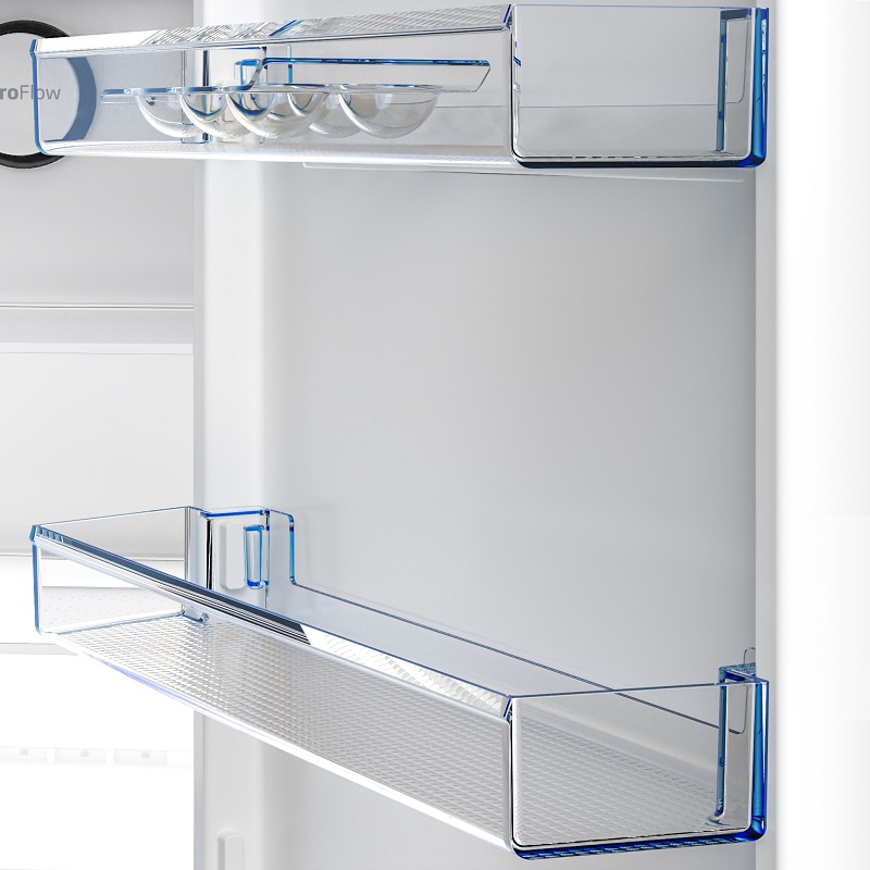 Im Kühlschrank ist es oft schwierig, alles zu sehen, besonders in den Ecken und hinten. Die LED-Beleuchtung mit LED-Streifen an der Oberseite und an jedem Ablagefach an der Seitenwand sorgt für optimale Sicht. Sie ist zudem energieeffizienter als herkömmliche Beleuchtung.