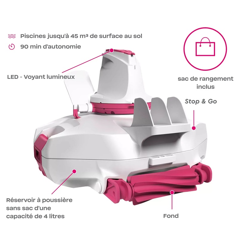 Der BWT BC200+ Poolroboter eignet sich besonders gut für die einfache Reinigung des Bodens von Aufstellpools und Pools bis zu 45 m². Sein verstellbares Vorderrad sorgt für eine optimale Poolreinigung. Eine LED-Akkustandsanzeige signalisiert, wenn der Poolroboter nur noch 10 Minuten einsatzbereit ist. Der BWT BC200+ Poolroboter wird außerdem mit einer Aufbewahrungstasche geliefert.