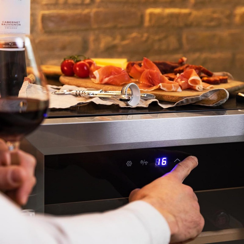 Dieser Weinkühlschrank mit Edelstahltür und -griff bietet Platz für 20 Flaschen, verfügt über einen Kühlkompressor, eine einstellbare Temperatur von 5 bis 18 °C und ein Touch-Bedienfeld.