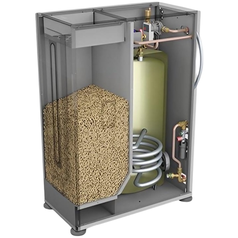 Ein Trägheitspufferspeicher, eine Wasserumwälzpumpe und Ausdehnungsgefäße für Heizung und Warmwasser sind serienmäßig im Kessel integriert.