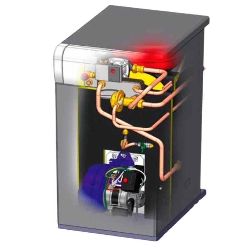 Dank der speziellen Brennerkonstruktion kann dieser Niedertemperatur-Dieselkessel mit einem ungedämmten 80 mm Abgasrohr installiert werden, selbst bei horizontalen Abschnitten. Dies führt zu erheblichen Einsparungen bei den Installationskosten.