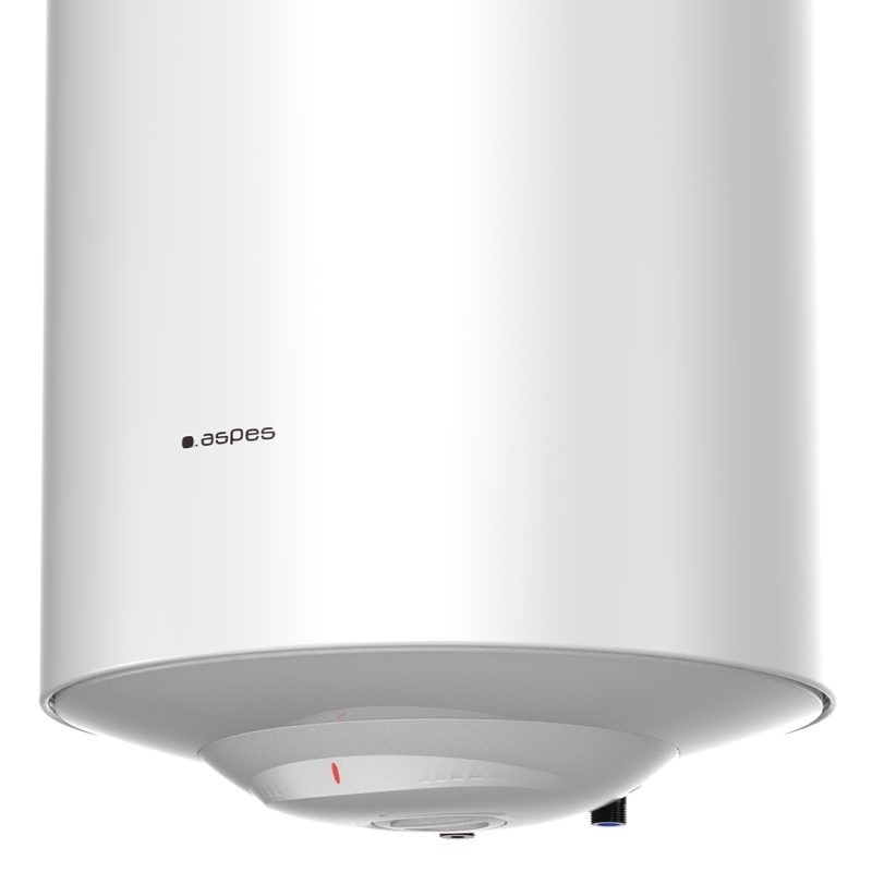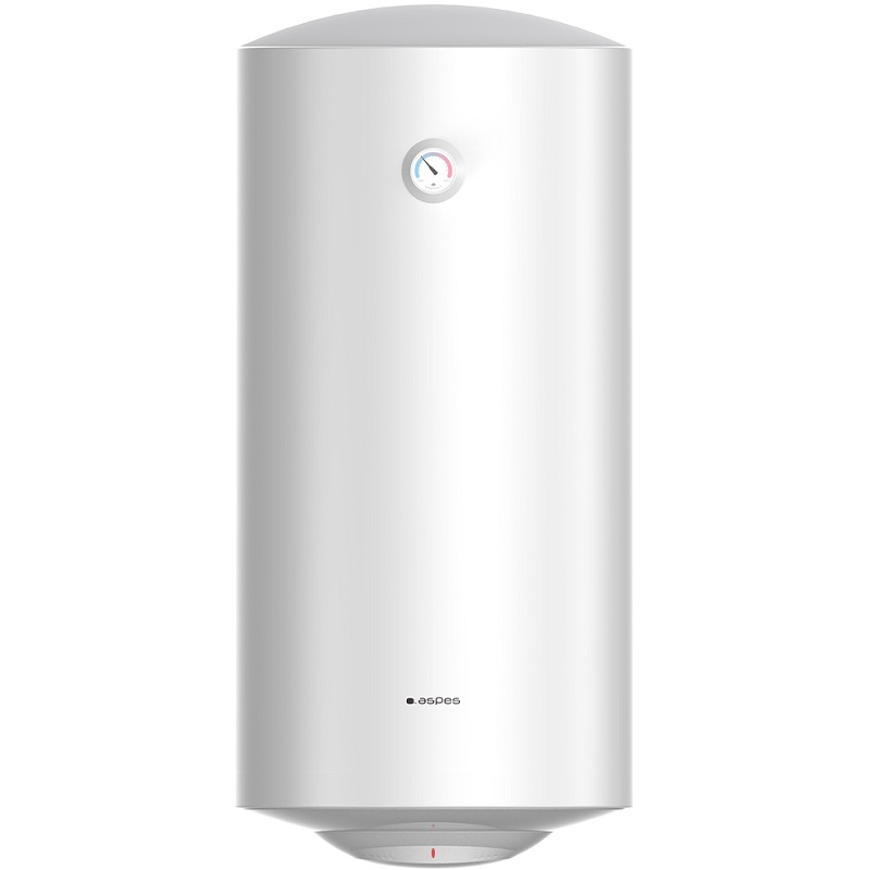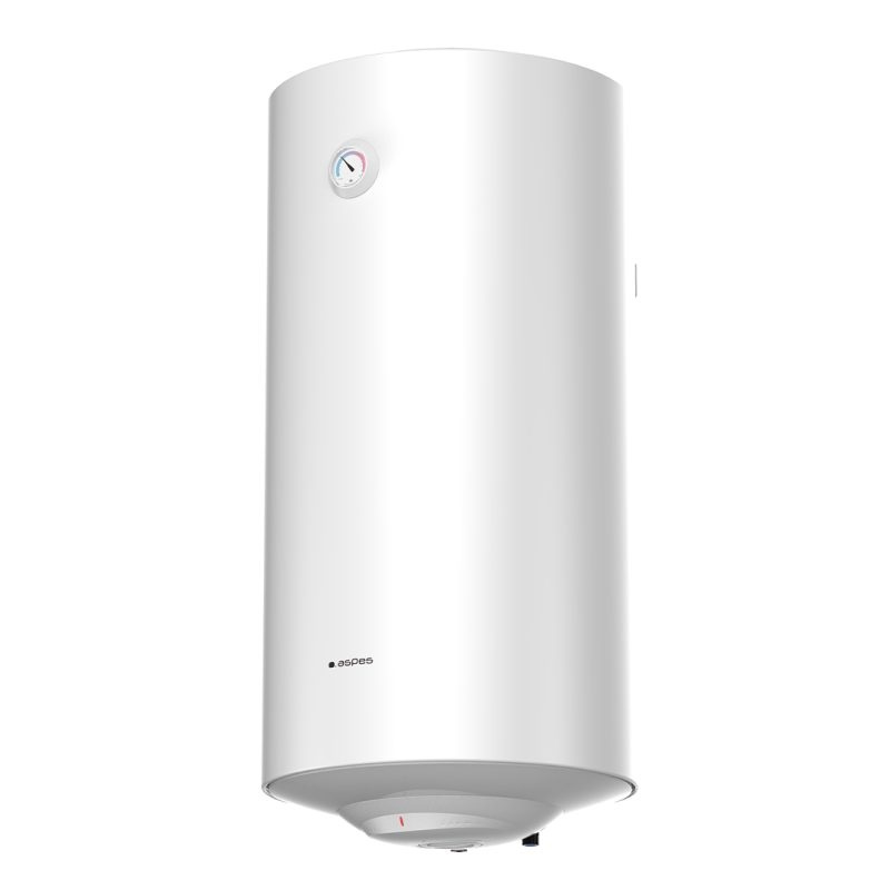 Vertikaler Warmwasserbereiter mit 100-Liter-Tank und einer Gesamtleistung von 1500 W. Energieeffizienzklasse C und maximaler Geräuschpegel von 15 dB. Weißes Gehäuse mit emailliertem Stahlinnenraum. Inklusive manuellem Bedienfeld, einstellbarer Temperatur bis 70 °C und analogem Thermometer.