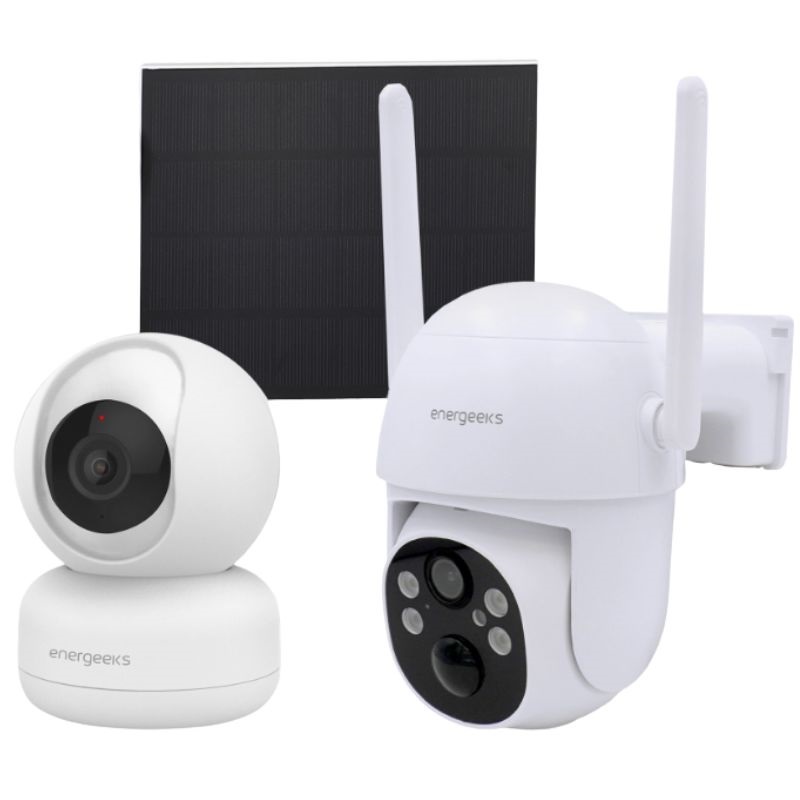 Ebergeeks Outdoor-Kit mit Kamera, Akku, 5-W-Solarpanel und WLAN-Innenkamera.