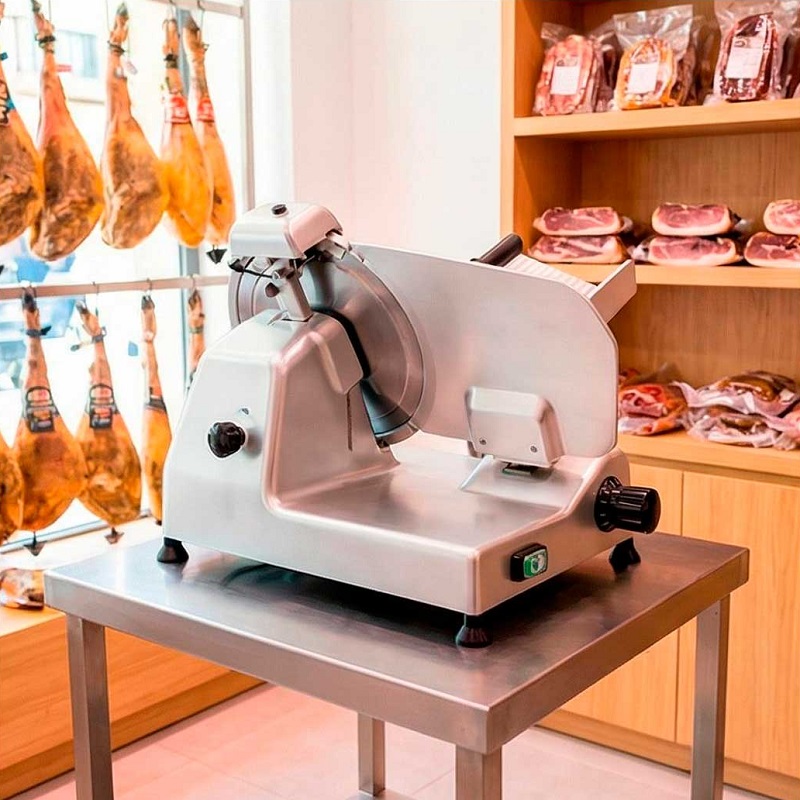 Der Schlitten ist auf selbstschmierenden Gleitlagern gelagert, die ein reibungsloses Gleiten gewährleisten und so das Schneiden von Wurstwaren, Braten usw. erleichtern. Trotz ihrer einfachen und sicheren Bedienung dürfen Fleischschneidemaschinen nur von geschultem Personal bedient werden, das die Bedienungs- und Wartungsanleitung vor jedem Gebrauch sorgfältig gelesen hat.