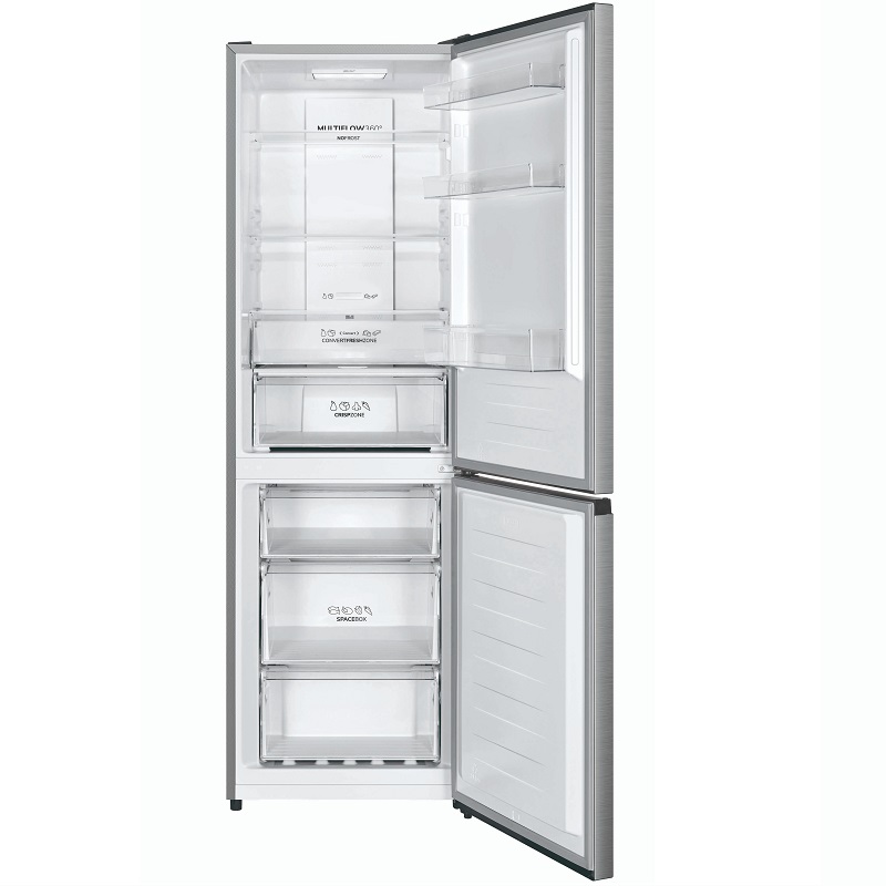 Mit einem Gesamtvolumen von 304 Litern bietet dieses Modell eine ausgewogene Aufteilung: ein geräumiges Kühlfach für frisches Obst und Gemüse und ein unteres Gefrierfach für den einfachen Zugriff auf Tiefkühlkost. Die Glasablagen sind robust und leicht zu reinigen, tragen auch schwere Behälter und bieten optimale Sicht auf den Inhalt. Die LED-Innenbeleuchtung verbessert die Sichtbarkeit der Lebensmittel und reduziert Schatten.