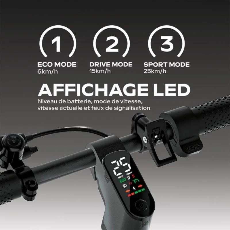 Die Reichweite von bis zu 25 Kilometern ermöglicht ausgedehnte Fahrten ohne häufiges Aufladen und macht den Roller ideal für den täglichen Arbeitsweg und kurze Freizeitausflüge. Dieses Modell, das Leistung, Reichweite und Stabilität optimal vereint, ist für alle Nutzer konzipiert, die sich in der Stadt effizient und komfortabel fortbewegen möchten. Der Elektroroller EZWAY EX100 ist eine geeignete Option für alle, die ein kompaktes und praktisches Elektrofahrzeug benötigen, das die üblichen Leistungs- und Haltbarkeitserwartungen in diesem Segment erfüllt.