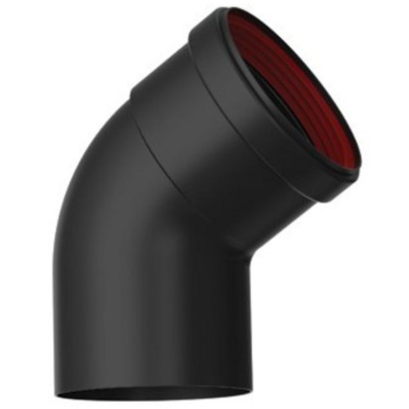 Einzelner 45°-Rohrbogen (M-H), 80 mm Durchmesser, aus emailliertem Edelstahl, für Pelletkaminofen-Abgasrohre aus stranggepresstem Aluminium mit Silikondichtungen. Mindestwandstärke des Abgasrohrs: 1 mm. Maximale Temperatur: 200 °C. Siehe Abbildung: 80°-45°-Rohrbogen.