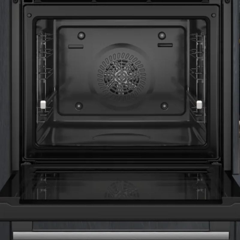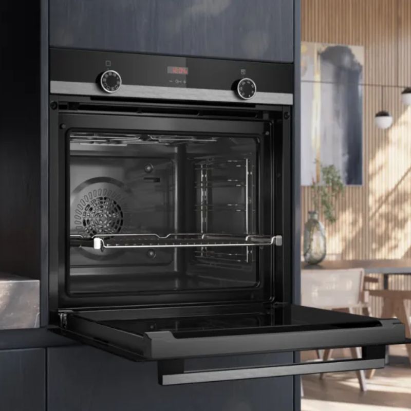 Dank der Teleskopauszüge lassen sich Bleche und Roste einfach aus dem Backofen nehmen. Die Führungen halten sie fest an ihrem Platz. So können Sie Ihr Backofenerlebnis von Anfang bis Ende voll und ganz genießen. humidClean Reinigungsassistent