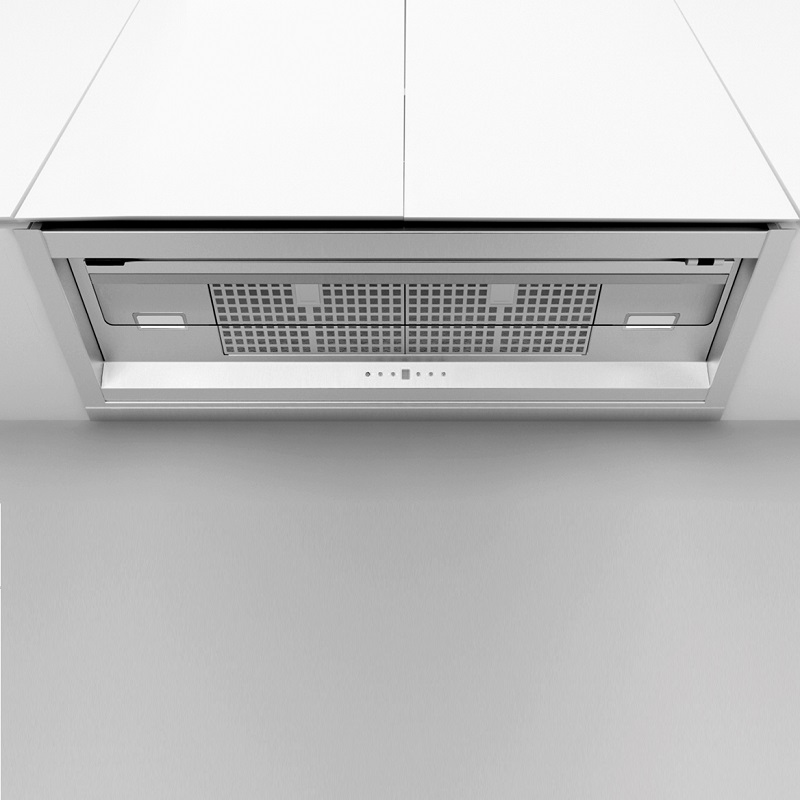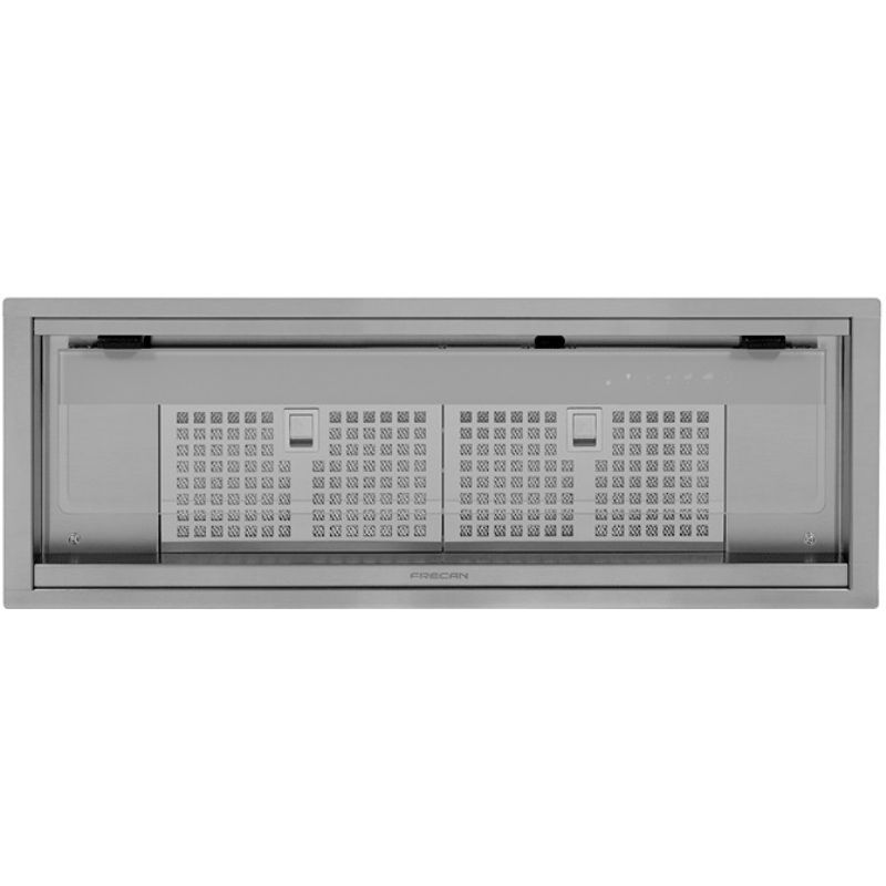 Die Frecan Note Einbau-Dunstabzugshaube aus Edelstahl ist vollständig in die Küchenzeile integriert und somit unsichtbar. Dank des absenkbaren Blendschutzes ermöglicht dieses Modell die Absaugung von Randbereichen (bei geschlossenem Blendschutz) oder die traditionelle Absaugung (bei geöffnetem Blendschutz). Letztere sorgt für eine bessere Absaugung bei Verwendung mit den vorderen Kochfeldern der Kochzone.