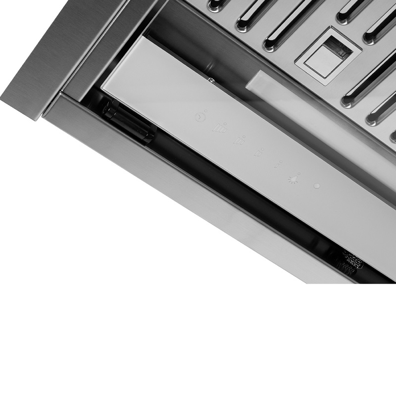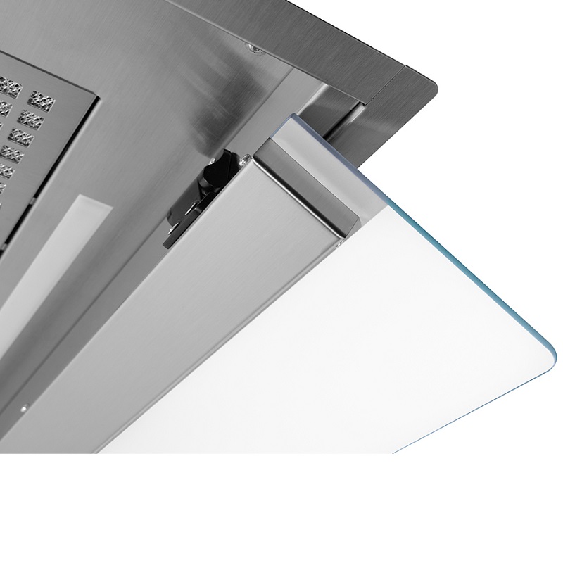 Die Frecan Note Einbau-Dunstabzugshaube aus Edelstahl ist vollständig in die Küchenzeile integriert und somit unsichtbar. Dank des absenkbaren Blendschutzes ermöglicht dieses Modell die Absaugung von Randbereichen (bei geschlossenem Blendschutz) oder die traditionelle Absaugung (bei geöffnetem Blendschutz). Letztere sorgt für eine bessere Absaugung bei Verwendung mit den vorderen Kochfeldern der Kochzone.