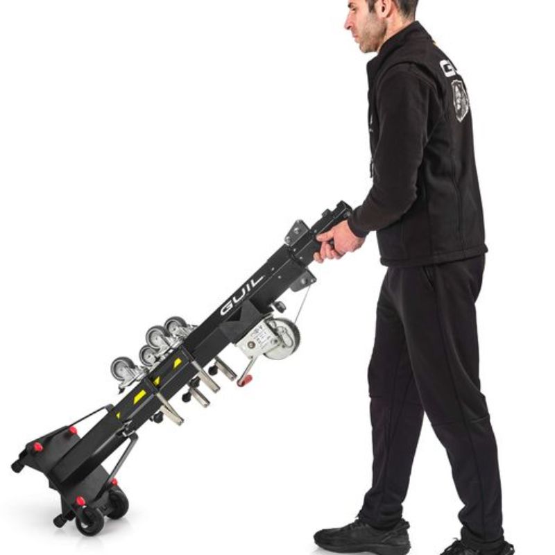 Der Hebezeug ist mit einem automatischen System ausgestattet, das die Mastsegmente auch im unbelasteten Zustand absenkt. Die Segmente senken sich automatisch unter dem Gewicht der Lastplattform ab. Dies vereinfacht die Arbeit mit dem Hebezeug erheblich. Dank dieses automatischen Systems ist kein Sicherheitsknopf erforderlich. Der kompakte Rahmen des Hebezeugs ermöglicht das Manövrieren durch jede Standardtür. Für eine einfache Handhabung ist der Rahmen mit zwei robusten Rollen ausgestattet. Jedes Hebezeug kann von einer einzelnen Person montiert und bedient werden, was Zeit spart und die Produktivität steigert.