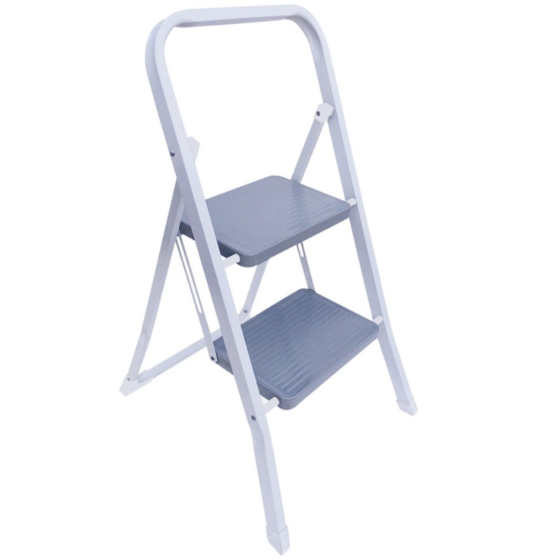 Zweistufige Stahlleiter mit elektroerosiver Oberfläche. Bank mit Stahlplattform und 480 mm Antirutschmatte, Ausklappsicherung und rutschfesten PE-Füßen. Maße: 200 x 300 mm