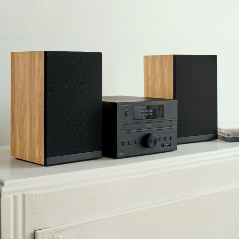 Das Thomson Mini-HiFi-System vereint Funktionalität und Stil in einem eleganten Design mit zwei Hauptfarben: Schwarz und Holz. So fügt es sich harmonisch in verschiedene Wohnräume ein. Dank Bluetooth-Verbindung können Sie Musik von kompatiblen Geräten kabellos abspielen.