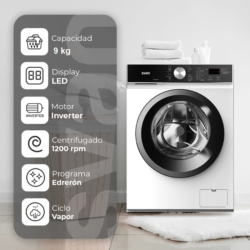 Diese Svan Frontlader-Waschmaschine hat ein Fassungsvermögen von 9 kg und eine maximale Schleuderdrehzahl von 1400 U/min. Ausgestattet mit einem Inverter-Motor für erhöhte Effizienz und Langlebigkeit (Svan bietet bis zu 10 Jahre Garantie auf den Motor), verfügt sie über eine elektronische Steuerung mit LED-Display, 12 Waschprogramme und Funktionen wie Startzeitvorwahl, Stop&Go und Trommelreinigung für optimale Waschergebnisse.