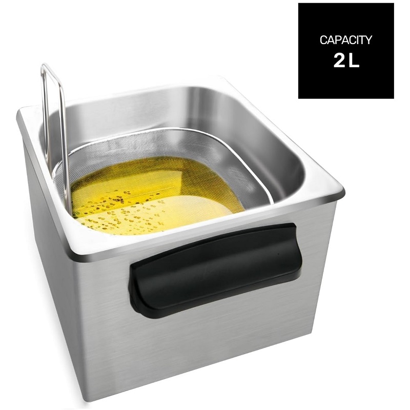 Das integrierte Filtersystem entfernt Rückstände und hält das Öl länger sauber, während gleichzeitig die Geschmacksübertragung zwischen den Lebensmitteln verhindert wird.