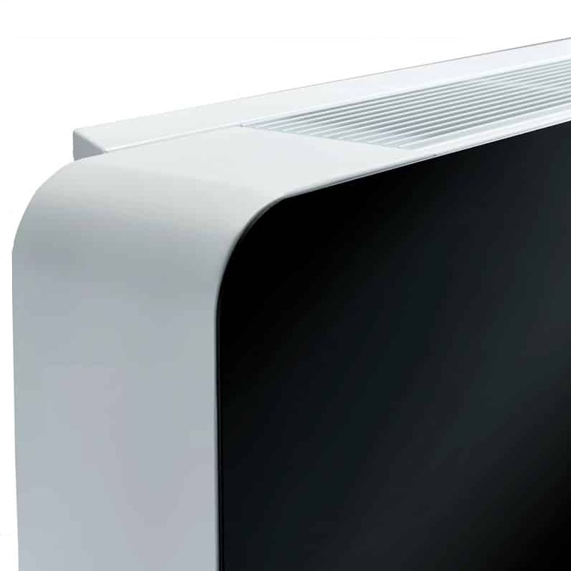 Wand-Luftentfeuchter der Marke TRAU, Modell DHC100-NR. Elegantes und funktionales Design, weiße Touch-Glasfront. Verdampfer- und Kondensatorschlange mit Epoxidbehandlung für Schwimmbadumgebungen, automatischer Start (Neustart nur bei Stromausfall), Gleichstromventilator mit 3 wählbaren Geschwindigkeiten.