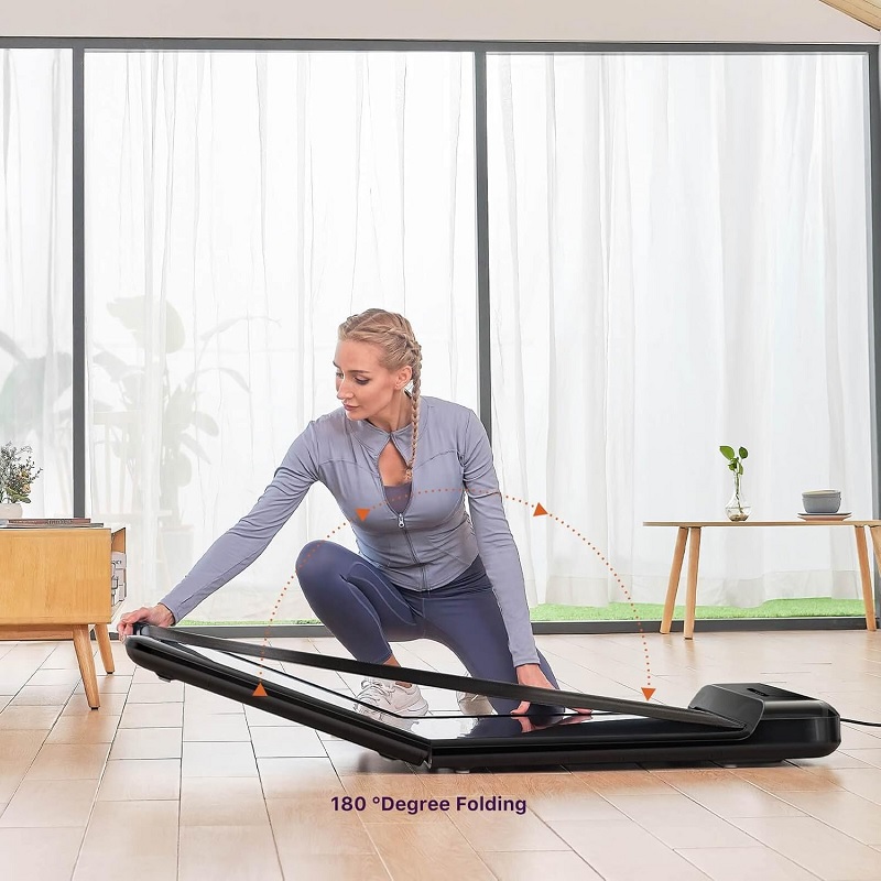 Faltbares Design: Das Laufband lässt sich zusammenklappen. Dank der zwei Rollen an der Unterseite lässt es sich mühelos auch in engen Nischen unter Schreibtisch, Sofa, Bett usw. bewegen.