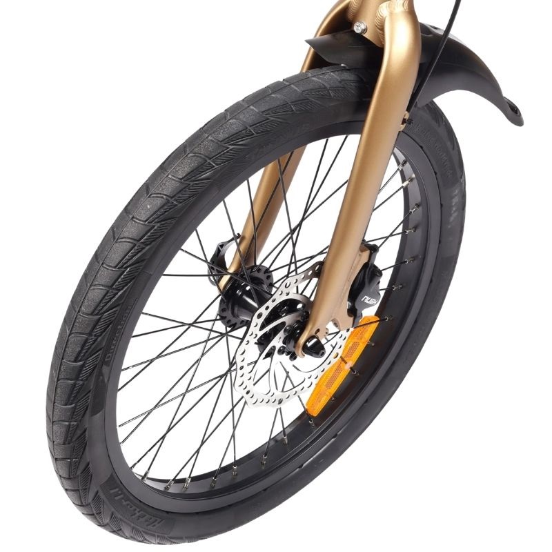 Das Fahrrad verfügt über 20-Zoll-Räder vorne und hinten. Diese Größe sorgt für optimale Manövrierfähigkeit und einfachen Transport und ist ideal für den Stadtverkehr oder kurze Ausflüge. Der integrierte Akku ermöglicht eine Reichweite von bis zu 45 km mit einer einzigen Ladung und bietet damit ausreichend Platz für den täglichen Bedarf. Die maximale Zuladung ist nicht angegeben, das Fahrrad ist jedoch für einen Fahrer und eine moderate Zuladung ausgelegt, entsprechend seiner Kategorie. Das Ladesystem ist mit europäischen Steckdosen kompatibel und gewährleistet so Komfort und Kompatibilität an jeder Haushalts- oder Standardladestation.